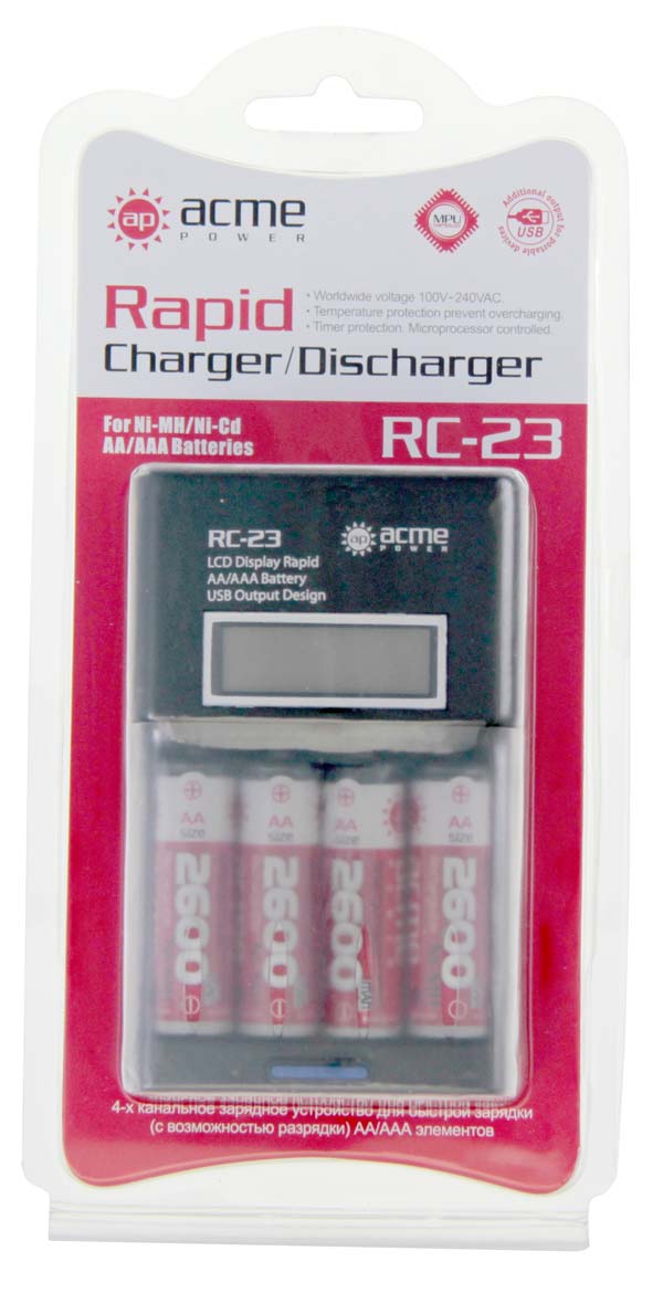 Интеллектуальное зарядное устройство нового поколения AcmePower RC-23, предназначено для зарядки никель-кадмиевых (Ni-Cd) и никель-металлгидридных (Ni-MH) аккумуляторов.